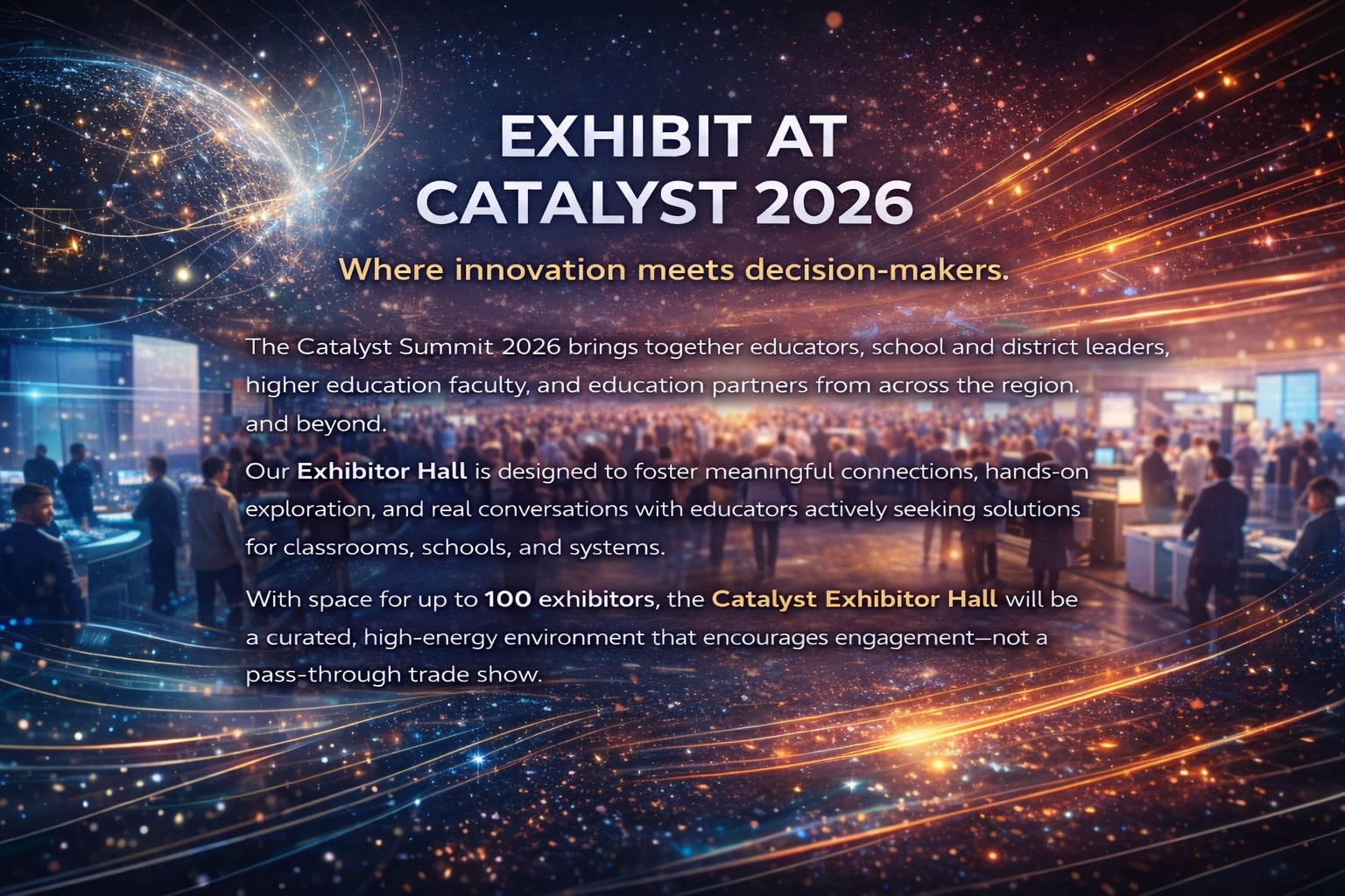The Catalyst Summit 2026 Exhibitor Hall is intentionally designed to prioritize quality connections over volume. With a capped number of exhibitors and dedicated networking windows built into the conference schedule, vendors have meaningful opportunities to engage with educators who are actively exploring solutions for classrooms, schools, and systems.